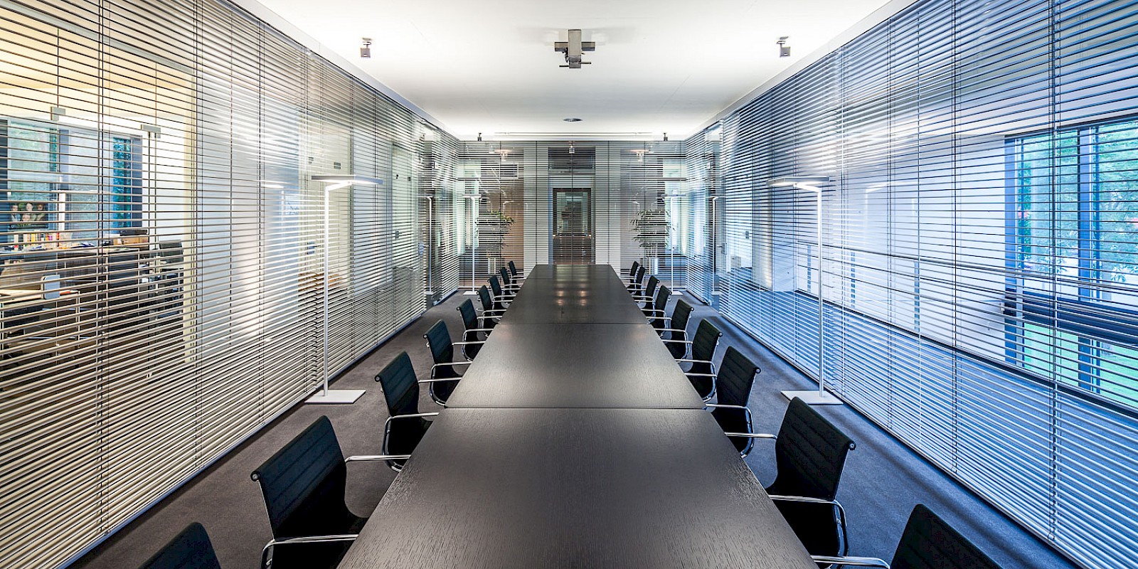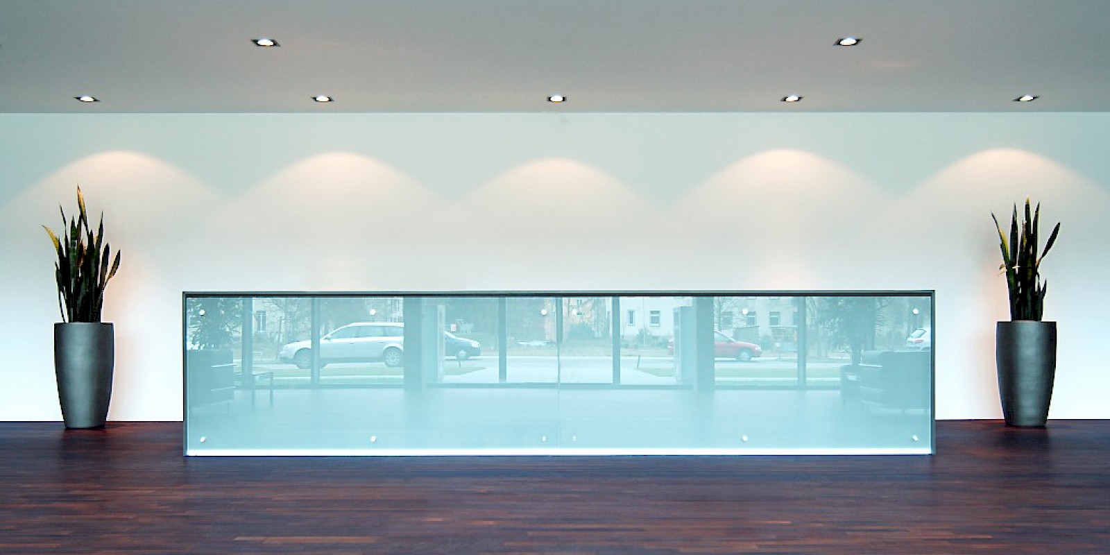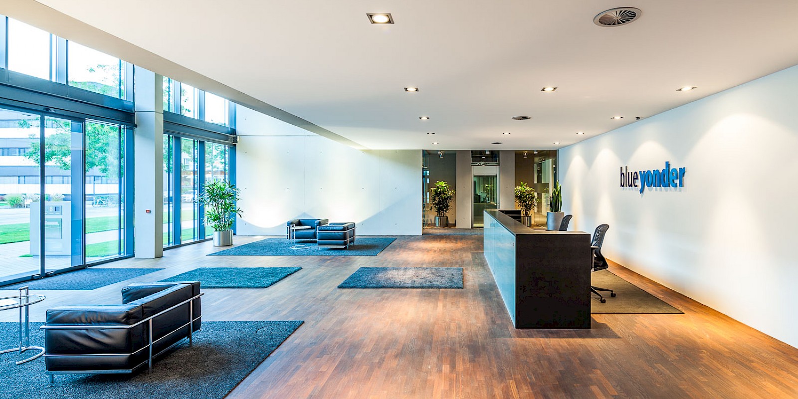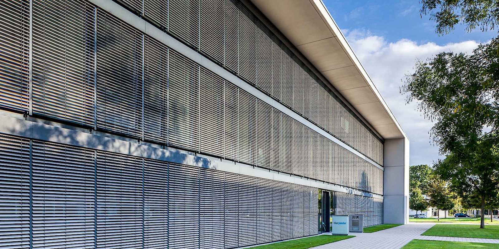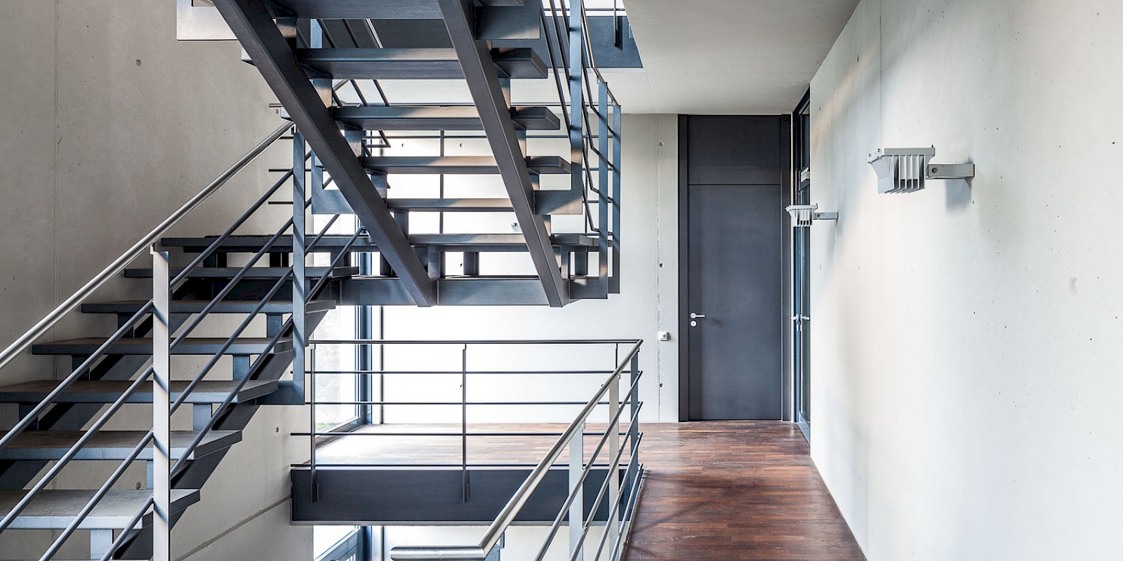 Radically unadorned and uncompromising, the building was designed as the headquarters for a renowned company in Karlsruhe. With a total floor area of 3,000 square meters, 1,000 square meters of space per floor was created on three floors for individual offices and open-plan offices in accordance with the specifications of the future tenant. If necessary, the building can be subdivided into six units. The impressive, centrally positioned lobby has two elevators that bring customers and employees to the office floors. The building, which is 55 meters long and 17.50 meters wide, was designed as a “combination office.” This zoning combines individual workspaces with common multifunction areas for meetings, archiving, and team project work. The individual workspaces are arranged along the windows and the multifunction areas are located in the center of the room. Shared spaces are divided by means of tall glass elements. The stairwells are docked at the end of each office block, creating a separate entrance away from the main area. At the same time, the kitchens, wardrobes, and toilets that are located there create the necessary functional space for users.