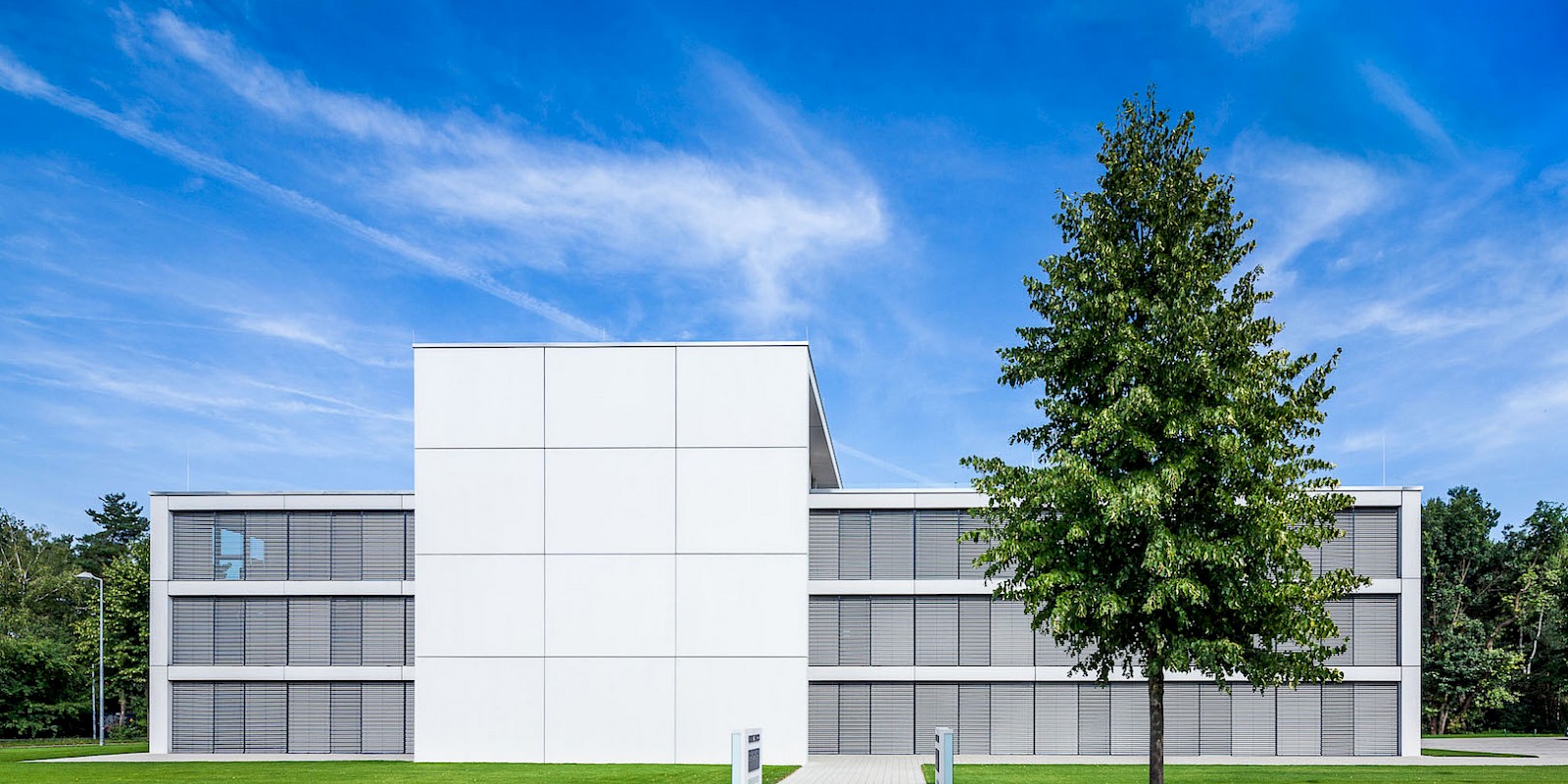 In keeping with the neighbouring building, concrete with integrated concrete core activation and floor-to-ceiling windows form the major architectural design elements. Two blocks of different heights and widths made of light exposed concrete penetrate through the middle and create the form of a cross in the floor plan. The fully enclosed narrow sides protrude and together with the cantilevered roof form a bordering frame. Because of the large number of folders and files, the A001GROUP worked with a specialized provider to develop removable partition systems with integrated cabinets and shelves with quality light-grey surfaces and floor-to-ceiling glass panels and glass doors. Special noise-absorbing partitions with perforated surfaces were installed in the meeting and conference rooms. The light-flooded office floor on the top level offers an open floor plan that can be configured individually according to the wishes of the user. A continuous row of windows along both length sides of the building offer a spectacular view over the tops of the trees of the nearby forest.